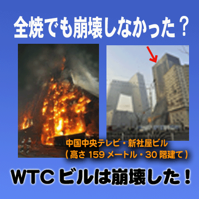 中国中央テレビの新社屋ビルが2月9日、夜通し燃え続け全焼したにもかかわらず翌10日鎮火後、ビルの骨格はそのまま残っていた。北京市当局者によれば火災の原因は「違法な花火打ち上げ」だそうだが、果たして額面通り信じていいものかギモンだ。まっ、原因の真意はさておくとして高さ159メートル、30階建ての高層ビルの鉄骨は溶解せずにしっかりとその姿を残していたことに注目すべきだ。あの9.11事件のWTCビルはごく一部の階の火災にもかかわらず全階崩壊してしまった。しかも鉄骨は粉々になって吹き飛んだのだ。どう見ても爆薬が仕掛けられていたとしか思えないのだがホワイトハウスは鉄骨が溶解したことが原因、と非科学的な釈明をした。 火災による鉄筋高層ビルの全倒壊は過去に前例がない。今回の中国中央テレビの火災がさらにそれを証明することになった。 9.11事件は限りなくホワイトハウスによる“自作自演”に近いことだけは間違いない。