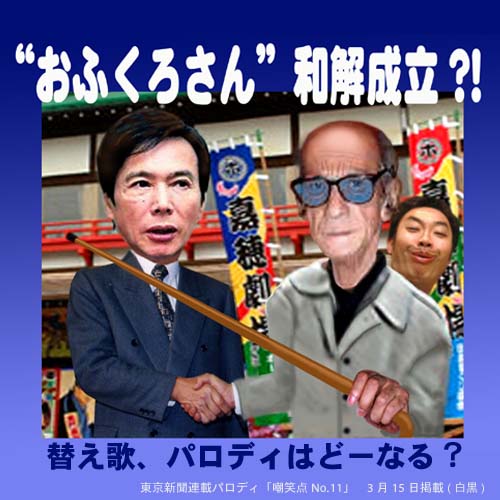 セリフ入りの「おふくろさん」を歌う森進一を作詞家の川内氏が許せない、と怒っているばかりか「俺の歌は全部歌わせない」と息まいている。そもそも、セリフ入り「おふくろさん」は30年ほど前から歌っているものだし、セリフの作詞を別の人に依頼したのは恐らく当時の所属プロダクション(ナベプロ)とレコード会社だったはず。恐らく森進一の意志ではないと思う。なぜならば当時売り出し中の新人歌手にそれだけの決定権はなかったはず。当時のナベプロは音楽業界を席巻するほどの権力を持っていた。さすがの川内氏もナベプロには楯突けなかったのではないか。もう一つはレコード会社の存在だ。彼らは当時の契約について釈明する必要がありそうだ。ところが矢面に立たされたのは森進一ただ一人。よく考えてみると川内氏の作詞とはまったく別の作詞家にセリフを作ってもらうよう依頼すること自体がヘンなのだ。しかもこの部分のメロディは猪俣氏の作曲だそうだ。ということは川内氏だけが爪弾きにあっていた、ということなのかもしれない。いずれにしても他人の作詞が冒頭に登場する事は作詞家のプライドが許さないに違いない。 川内氏は一昨年のNHK紅白で歌っているのを見て知った、と言っている。これはおかしい。著作権違反だと判断するなら30年前に訴えていなければならないはず。もうとっくに時効じゃないか。しかも怒りをエスカレートさせて「俺の歌は全部歌わせない」と言っているがこれは明らかに間違っている。作詞家一人の勝手な判断は許されるものではない。当然ながら作曲家の考えも尊重しなければならないことは言うまでもない。「おふくろさん」のケースなら猪俣公章氏がどう判断するかが重要だ。今は亡き猪俣氏なら多分、こう嘆き提案するだろう。 「森進一の歌を愛しているファンの心を一番大切にしなくてはダメだな。森くんが歌うからこそ『おふくろさん』は名曲として息長く愛されている、ということを川内さんは知るべきだと思う。北島三郎や氷川きよしでも感じが出ない。天国に来たら二人で『おふくろさん』を歌おう、と言っていたじゃないか。もちろんセリフ抜きでね(^▽^)」 森進一と川内氏の二人が固く握手して和解する日が来ることを心から願っている人がいる。歌まね・ものまねの天才、コロッケだ。 ところで替え歌(パロディー)とかものまね(歌まね)と著作権はどーなんだろうか。 朝日新聞(3月15日)「文化総合」欄にこの問題が取り上げられている。「替え歌メドレー」で知られる嘉門達夫さんの事務所によると作詞、作曲者、替え歌の歌詞の中に登場する著名人にも事前の許可を得ているそうだ。これは厳密な意味でパロディーではない、と言わざるをえない。許諾を得てしまっては毒がなくなってしまうからだ。毒のない(批判精神のない)パロディーはパロディーではない。それは単なる「パロディーもどき」なのだ。だからと言って嘉門さんの芸を否定するものではない。彼の替え歌はもはや『名人芸』である。 さて、外国ではどうか。フランスには法律でパロディーを明確に規定している。米国でも有名な曲を下品な歌詞でラップ調にしたものがある。裁判で訴えられたが「新たな意味やメッセージを持った作品に仕上げている」との判決が出てパロディーが勝訴している、と著作権に詳しい福井健策弁護士は話す。とくに次の話は傾聴に値するものだ。 「著作権の意に添わないからといってパロディーや替え歌をすべて認めないのは法の判断停止ではないか。オリジナルへの批判的な視点は、文化を豊かにするのだが」 話が前後するるが福井弁護士は「おふくろさん」の改変版については「新しい視点は生まれておらず、付け加えるならもとの作者(川内氏)に頼めばいいのに」と否定的だ。