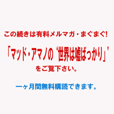 メルマガの「まぐまぐ!(有料登録)」が3月11日(月)からスタートします。 タイトルは『マッド・アマノの"世界は嘘ばっかり"(〜B層よ、"怒りと嘲笑"の槍をもって巨大風車に立ち向かえ!〜)』。